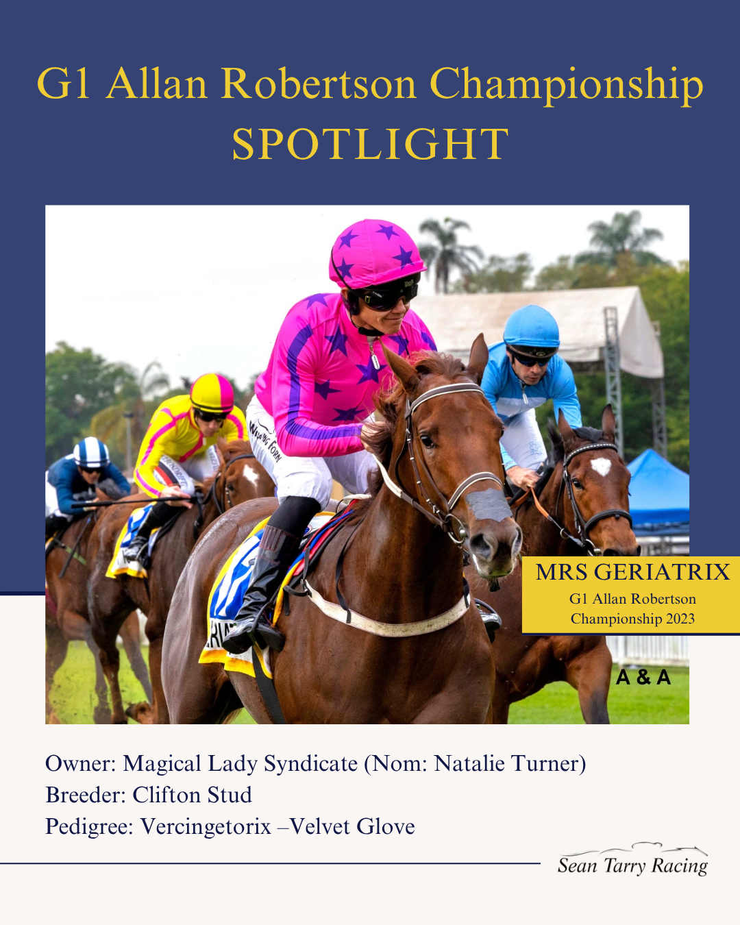 Mrs Geriatrix, who had previously won both the G2 World Sports Betting SA Fillies Nursery and Listed Ruffian Stakes, would go on to claim the G2 Zulu Kingdom Explorer Golden Slipper.